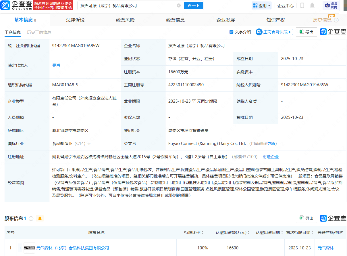 企查查APP显示,近日,扶摇可接(咸宁)乳品有限公司成立,法定代表人为吴肖,注册资本为1.66亿元,经营范围包含:乳制品生产;食品销售;保健食品生产;食品添加剂生产;酒类经营;饮料生产等。企查查股权穿透显示,该公司由元气森林(北京)食品科技集团有限公司全资持股。