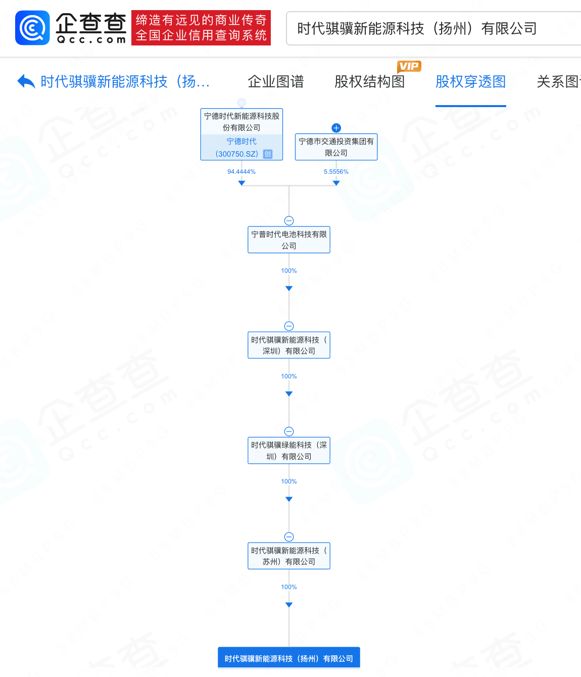 企查查APP显示,近日,时代骐骥新能源科技(扬州)有限公司成立,法定代表人为宋庆龙,注册资本500万人民币,经营范围包括新兴能源技术研发、新能源汽车换电设施销售、合同能源管理、电池销售等。企查查股权穿透显示,该公司由宁德时代(300750)间接持股。