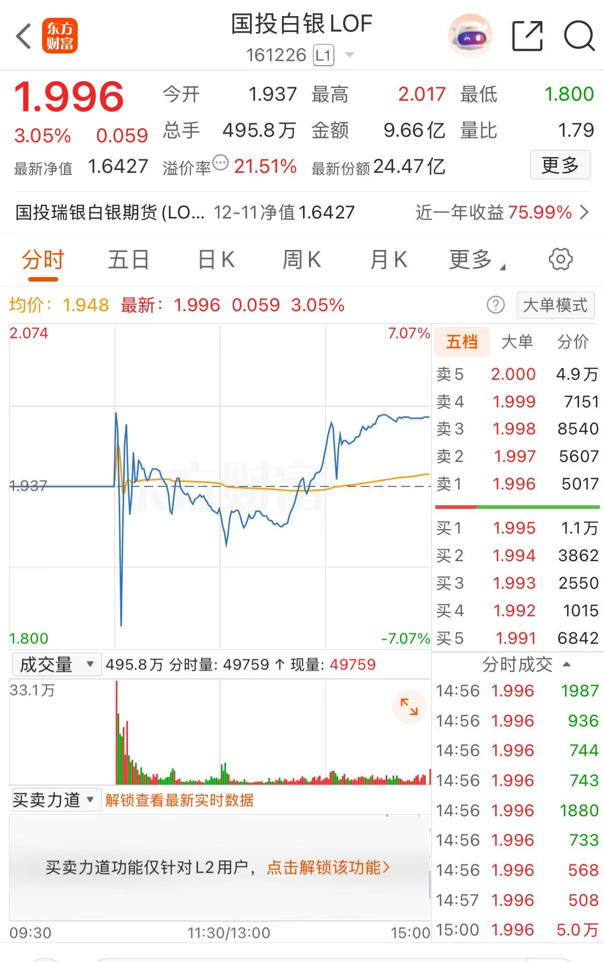 当日复牌后,国投白银LOF经历了较大幅度的震荡,盘中一度跌超7%,但随后快速走高,截至收盘仍涨超3%,当日振幅超过10%,成交金额达9.66亿元,创下历史新高,溢价率也达到21.51%。