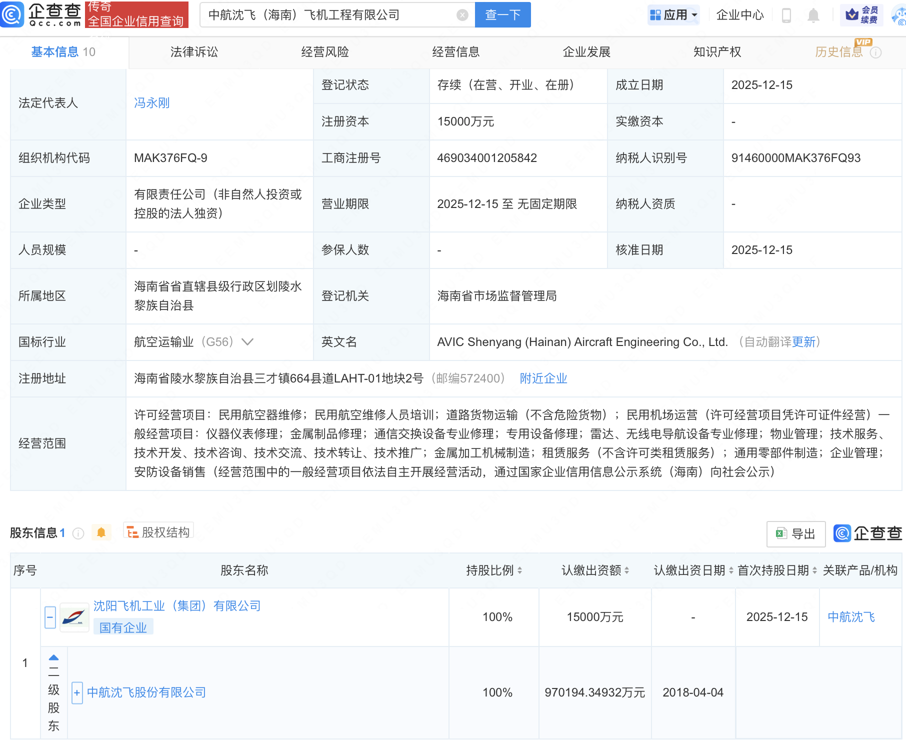 企查查APP显示,近日,中航沈飞(海南)飞机工程有限公司成立,注册资本1.5亿元,经营范围包含:民用航空器维修;民用航空维修人员培训;道路货物运输(不含危险货物)等。企查查股权穿透显示,该公司由中航沈飞(600760)间接全资持股。