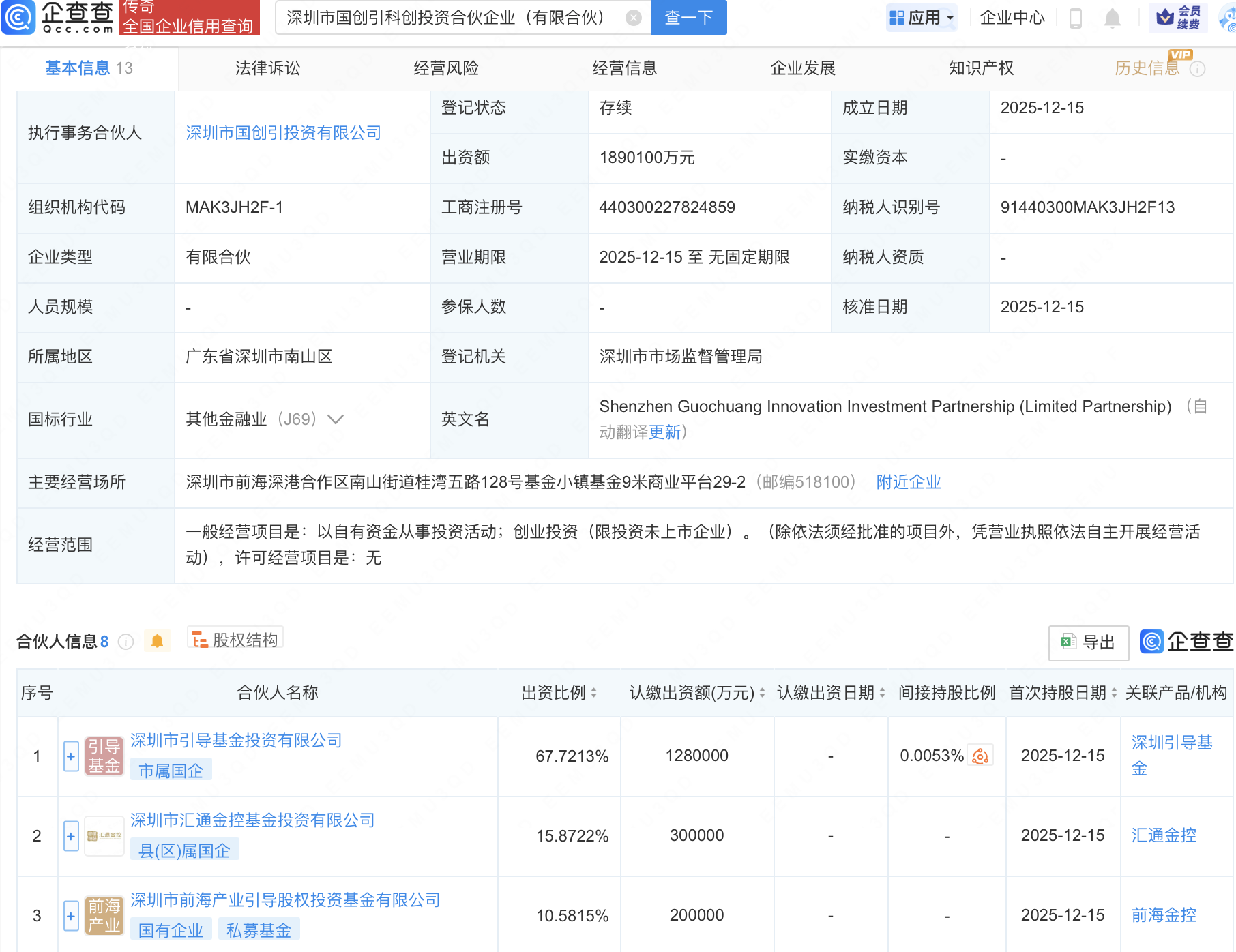 企查查APP显示,近日,深圳市国创引科创投资合伙企业(有限合伙)成立,出资额189.01亿元,经营范围包含:以自有资金从事投资活动;创业投资(限投资未上市企业)。企查查股权穿透显示,该企业由深圳市引导基金投资有限公司等共同出资。