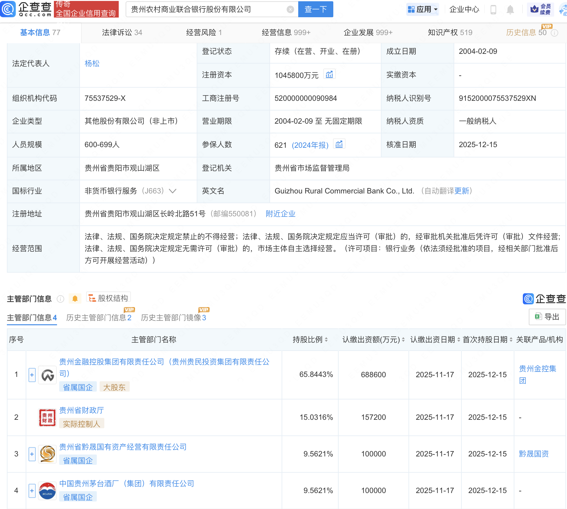 企查查APP显示,近日,原贵州省农村信用社联合社发生工商变更,企业名称变更为贵州农村商业联合银行股份有限公司,新增贵州省财政厅、中国贵州茅台酒厂(集团)有限责任公司等为股东,其中茅台集团持股约9.6%。同时,公司注册资本由2610万元增至104.58亿元。企查查信息显示,该公司成立于2004年,经营范围包含银行业务。近期,国家金融监督管理总局贵州监管局发布批复,准予贵州农村商业联合银行股份有限公司(简称贵州农商联合银行)开业。