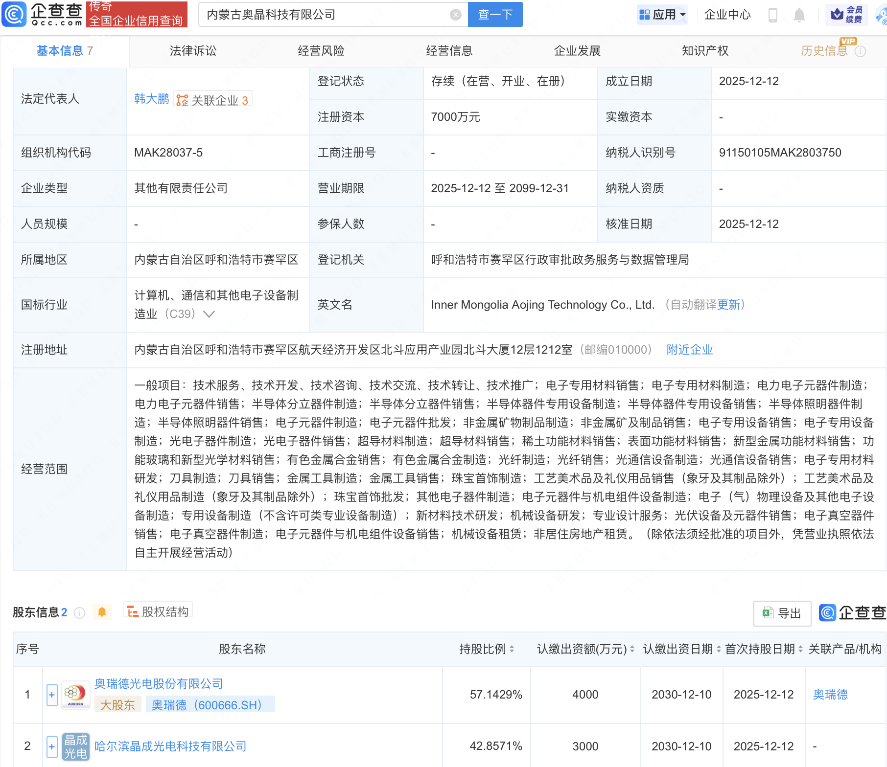 企查查APP显示,近日,内蒙古奥晶科技有限公司成立,注册资本7000万元,经营范围包含:半导体分立器件制造;半导体分立器件销售;半导体器件专用设备制造;半导体器件专用设备销售;半导体照明器件制造等。企查查股权穿透显示,该公司由奥瑞德(600666)等共同持股。