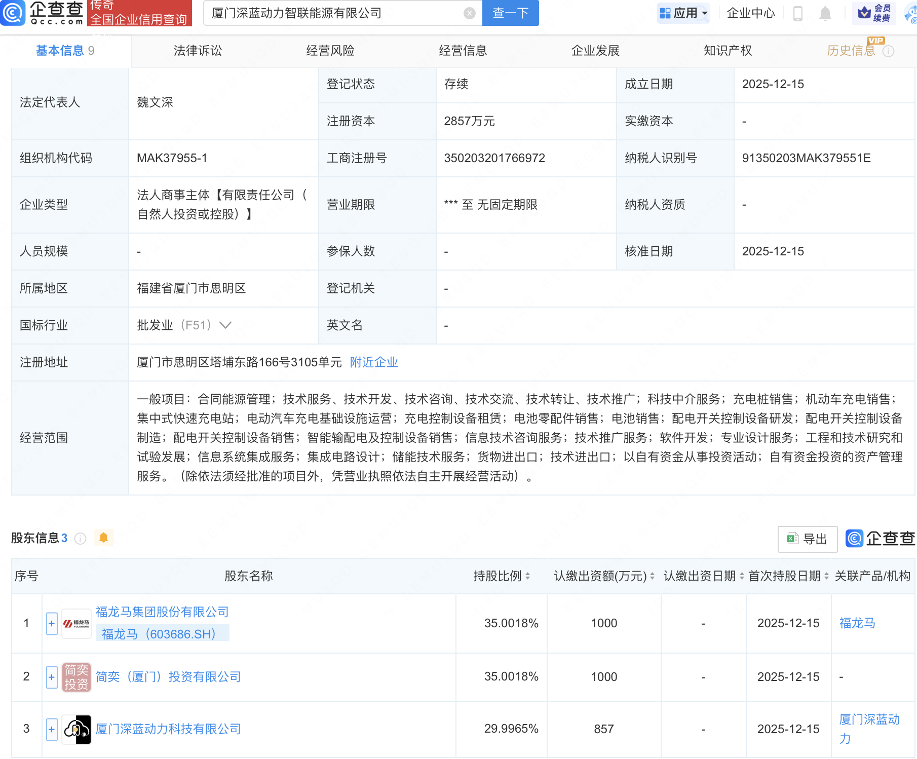 企查查APP显示,近日,厦门深蓝动力智联能源有限公司成立,经营范围包含:机动车充电销售;集中式快速充电站;电动汽车充电基础设施运营;集成电路设计等。企查查股权穿透显示,该公司由福龙马(603686)等共同持股。