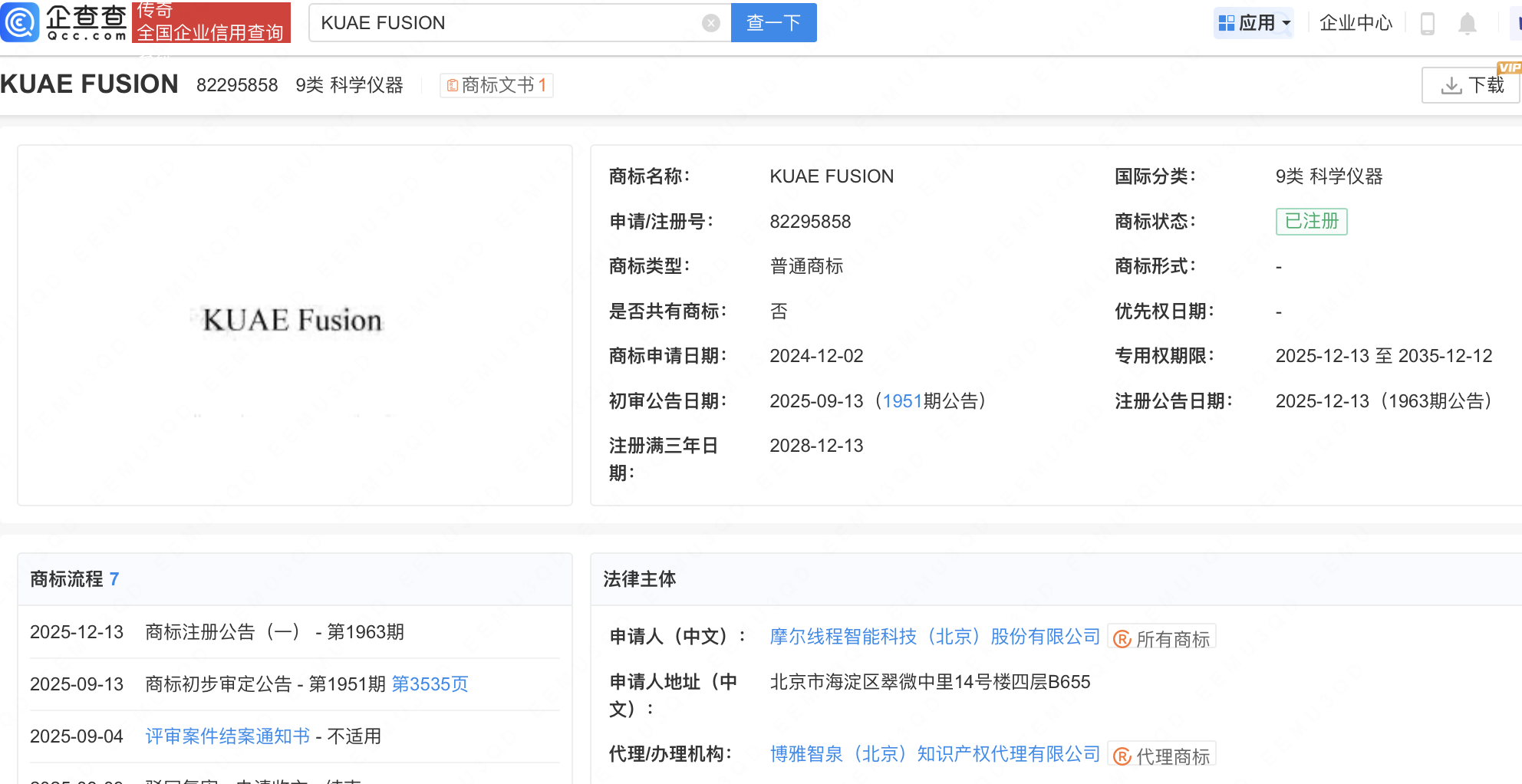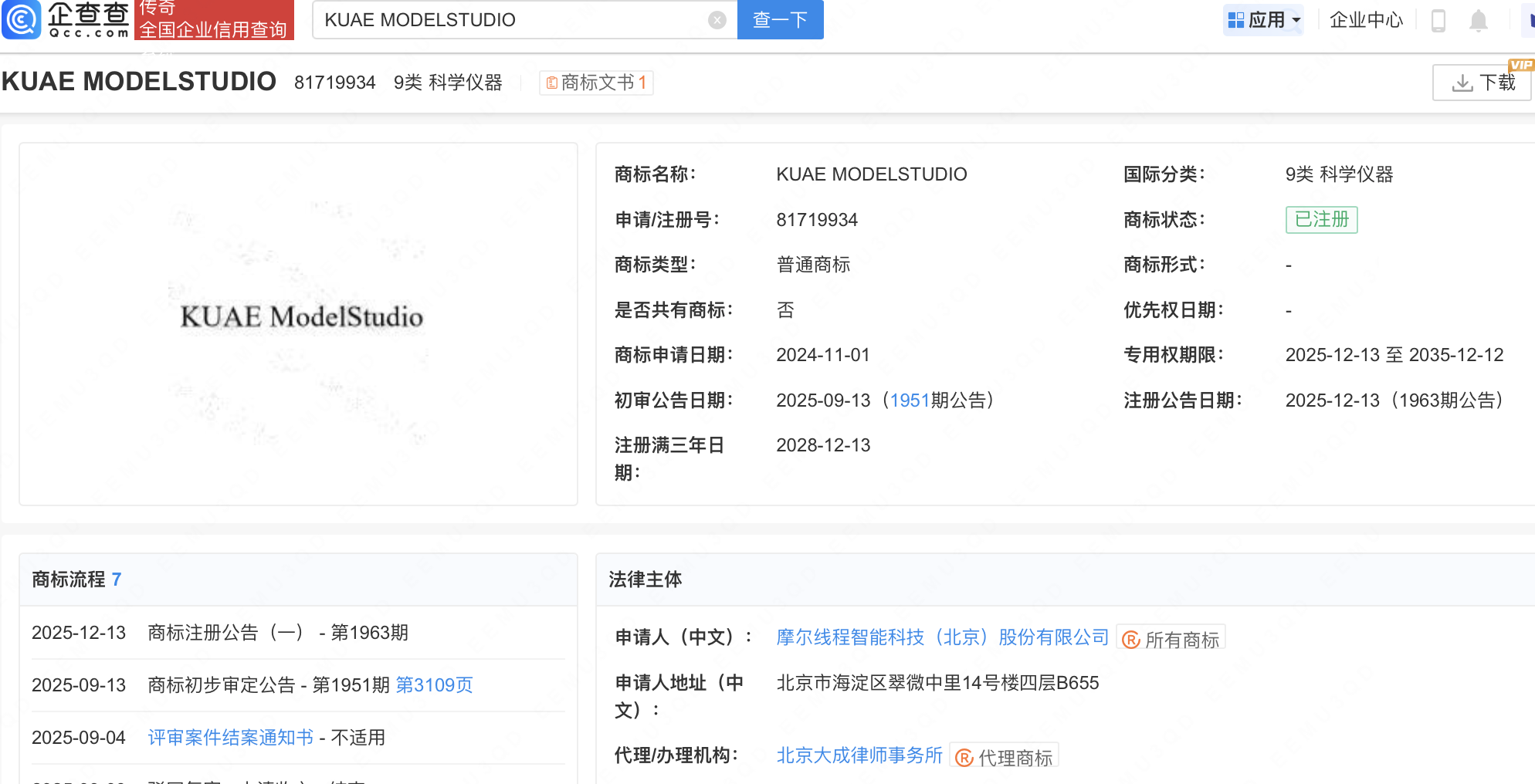 企查查APP显示,近日,摩尔线程(688795)成功注册“KUAE FUSION”、“KUAE MODELSTUDIO”商标,国际分类均为科学仪器。