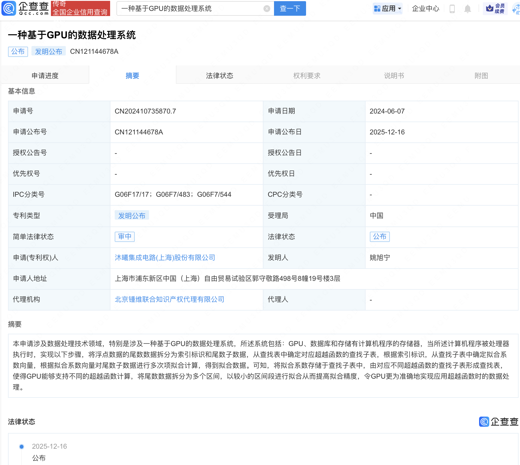 企查查APP显示,近日,沐曦股份(688802)“一种基于GPU的数据处理系统”专利公布。企查查专利摘要显示,本申请所述系统包括:GPU、数据库和存储有计算机程序的存储器,当所述计算机程序被处理器执行时,实现以下步骤,将浮点数据的尾数数据拆分为索引标识和尾数子数据,从查找表中确定对应超越函数的查找子表,根据索引标识,从查找子表中确定拟合系数向量,根据拟合系数向量对尾数子数据进行多次项拟合计算,得到拟合数据。可知,将拟合系数存储于查找子表中,由对应不同超越函数的查找子表形成查找表,使得GPU能够支持不同的超越函数计算,将尾数数据拆分为多个区间,以较小的区间段进行拟合从而提高拟合精度,令GPU更为准确地实现应用超越函数时的数据处理。