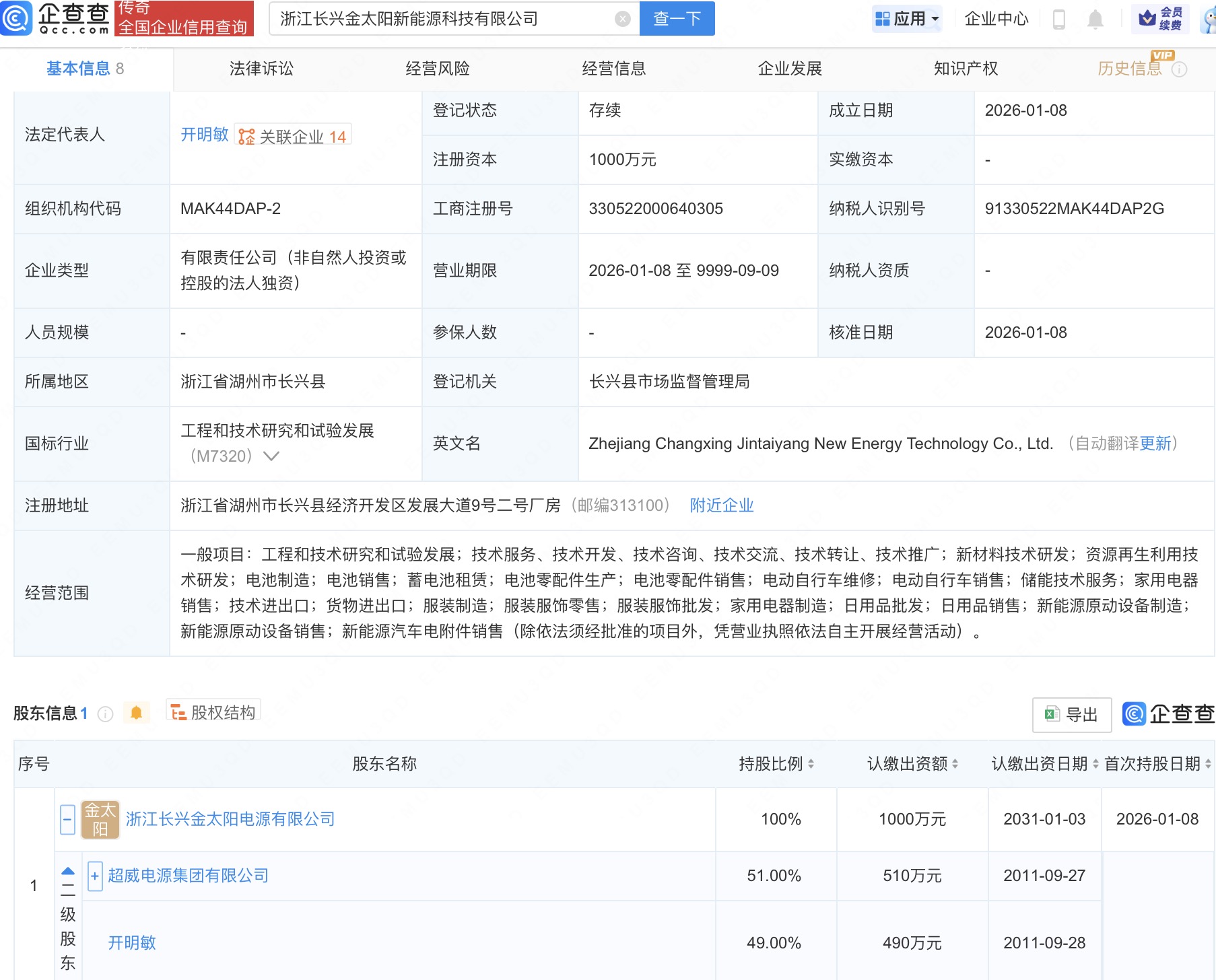 企查查APP显示,近日,浙江长兴金太阳新能源科技有限公司成立,法定代表人为开明敏,注册资本1000万人民币,经营范围含资源再生利用技术研发、电池制造、电池销售、蓄电池租赁、储能技术服务等。企查查股权穿透显示,该公司由超威电源集团旗下浙江长兴金太阳电源有限公司全资持股。