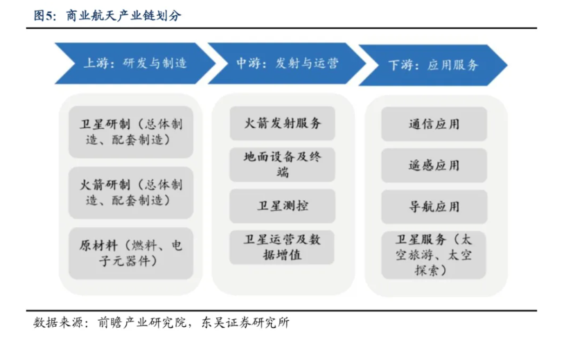 从产业链结构来看,商业航天产业上游主要聚焦于研发与制造领域,包括卫星制造以及火箭制造等环节;中游主要涉及发射服务与测控运营环节;下游则则主要是卫星应用和数据服务环节。