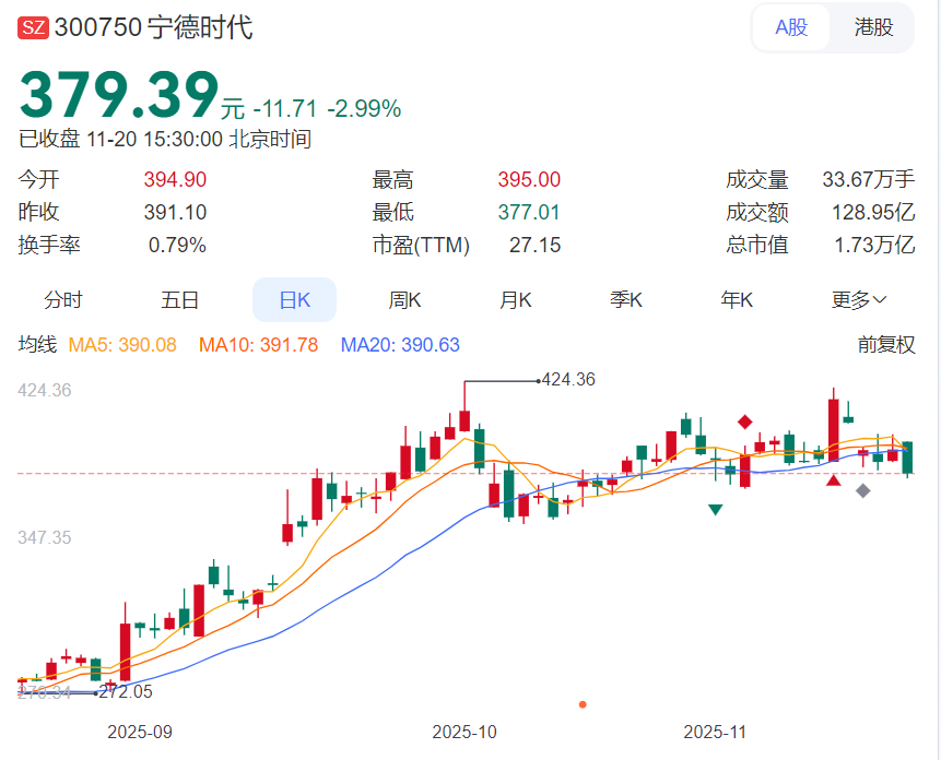 “连创始团队都开始卖,我还敢拿吗?”11月17日开盘前,宁德时代散户群里跳出一句感叹。自嘲被量化成冷冰冰的数字:最近几个交易日,宁德时代股价跌跌不休。