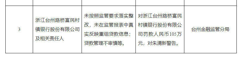 因贷款管理不审慎等问题浙江台州路桥富民村镇银行被罚105万元