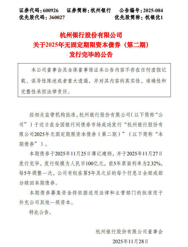 本期债券于2025年11月25日簿记建档,并于2025年11月27日发行完毕,发行规模为100亿元,前5年票面利率为2.32%,每5年调整一次,该公司有权在第5年及之后的每个付息日全部或部分赎回本期债券。本期债券募集资金将依据适用法律和主管部门的批准用于补充杭州银行其他一级资本。