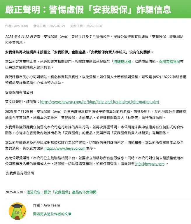 中保新知调查了解到,作为香港的虚拟一般保险公司,真正的安我保险已在今年1月、7月及9月份,连续发布三条澄清公告,提醒公众警惕有关虚假“安我股保”诈骗网站和不实信息,并强调未授权“安我股保”金融产品,与“安我股保负责人林新天”没有任何关系,并明确表示已通知警方相关部门。