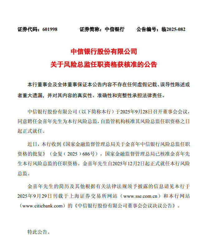 2025年9月28日,中信银行召开董事会会议,同意聘任金喜年为风险总监,自监管机构核准其风险总监任职资格之日起正式就任。