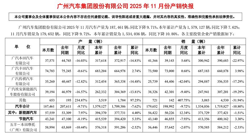 近日,广州汽车集团股份有限公司(以下简称“广汽集团”)发布了2025年11月份产销快报,其中广汽传祺的销量数据格外刺眼,11月份销量为25739辆,相比去年同期的44406辆大幅下滑42.04%,近乎“腰斩”。对比其他品牌,合资品牌广汽本田11月份销量为41366辆,同比增长5.68%;广汽丰田销量为73500辆,同比微增0.71%;即便同样面临挑战的广汽埃安,11月份销量为38326辆,同比下降9.40%,下降幅度也远小于传祺。从累计数据看,广汽传祺1-11月累计销量为294887辆,相比去年同期累计销量356535辆下滑17.29%,市场压力显而易见。