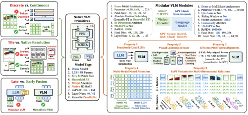 当前,业内主流的多模态模型大多遵循“视觉编码器+投影器+语言模型”的模块化范式。这种基于大语言模型(LLM)的扩展方式,虽然实现了图像输入的兼容,但本质上仍以语言为中心,图像与语言的融合仅停留在数据层面。这种“拼凑”式的设计不仅学习效率低下,更限制了模型在复杂多模态场景下(比如涉及图像细节捕捉或复杂空间结构理解)的处理能力。