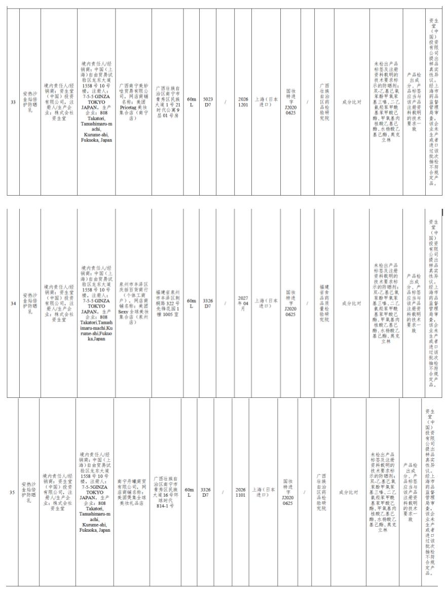 3款安热沙防晒乳被检出不合格,资生堂(中国)对样品真实性提出异议
