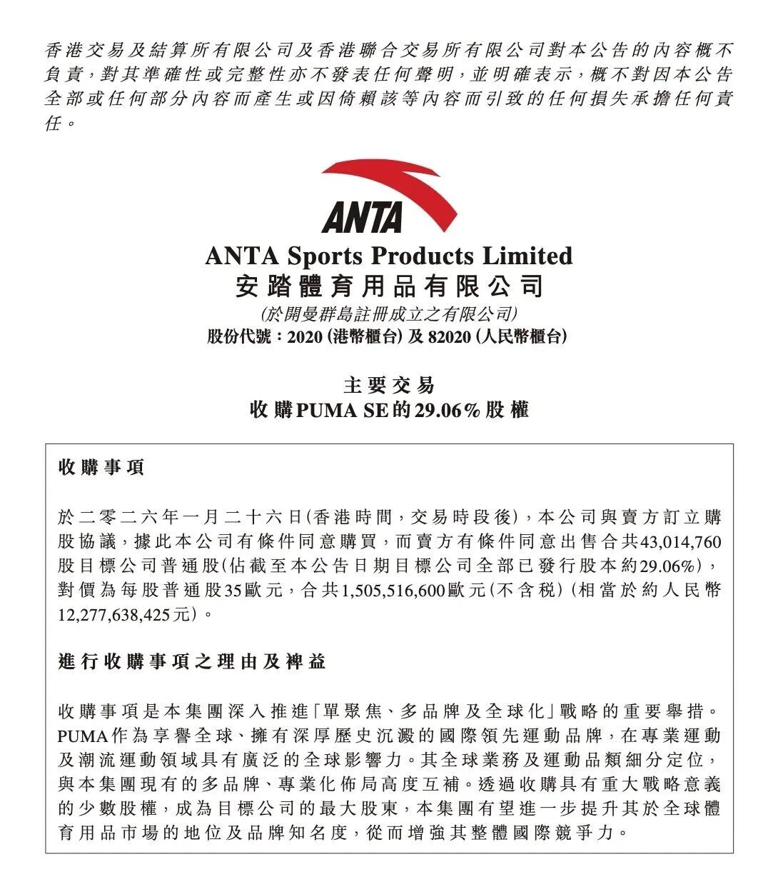 安踏在公告中表示,彪马在专业运动及潮流运动领域的全球影响力,与安踏现有品牌布局高度互补。