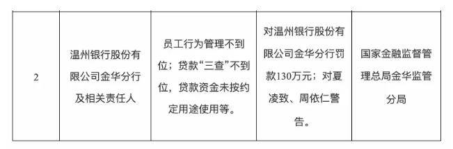 2月9日,国家金融监督管理总局金华监管分局发布的行政处罚信息公开表显示,温州银行股份有限公司(下称“温州银行”)金华分行因“员工行为管理不到位;贷款‘三查’不到位,贷款资金未按约定用途使用等”违法违规行为,被罚款130万元;相关责任人夏凌致、周依仁被警告。