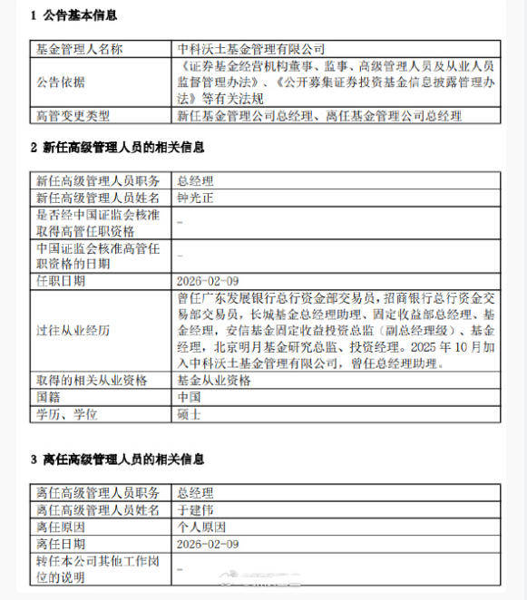 2月10日,中科沃土基金管理有限公司(下称“中科沃土基金”)发布高级管理人员变更公告,钟光正新任总经理,任职日期为2月9日,原总经理于建伟因个人原因于2月9日离任。