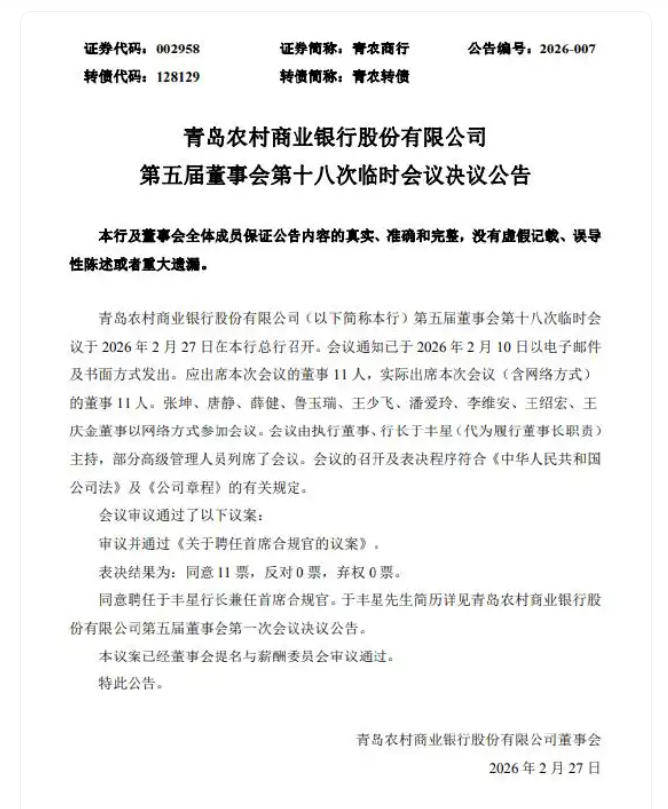 2月27日,青岛农村商业银行(002958,SZ,下称“青农商行”)发布公告指出,该行第五届董事会第十八次临时会议审议并通过《关于聘任首席合规官的议案》,同意聘任行长于丰星兼任首席合规官。