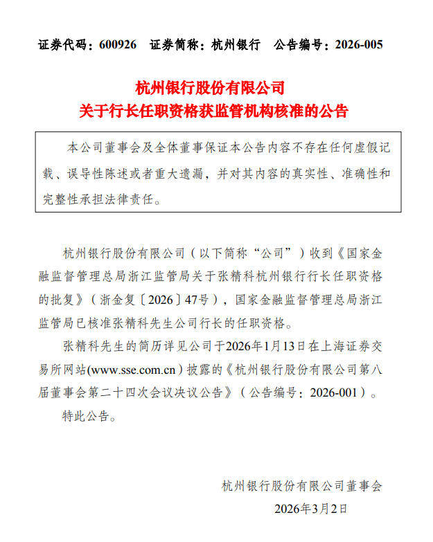 3月1日,杭州银行股份有限公司(600926.SH,下称“杭州银行”)发布公告称,收到《国家金融监督管理总局浙江监管局关于张精科杭州银行行长任职资格的批复》,国家金融监督管理总局浙江监管局已核准张精科行长的任职资格。