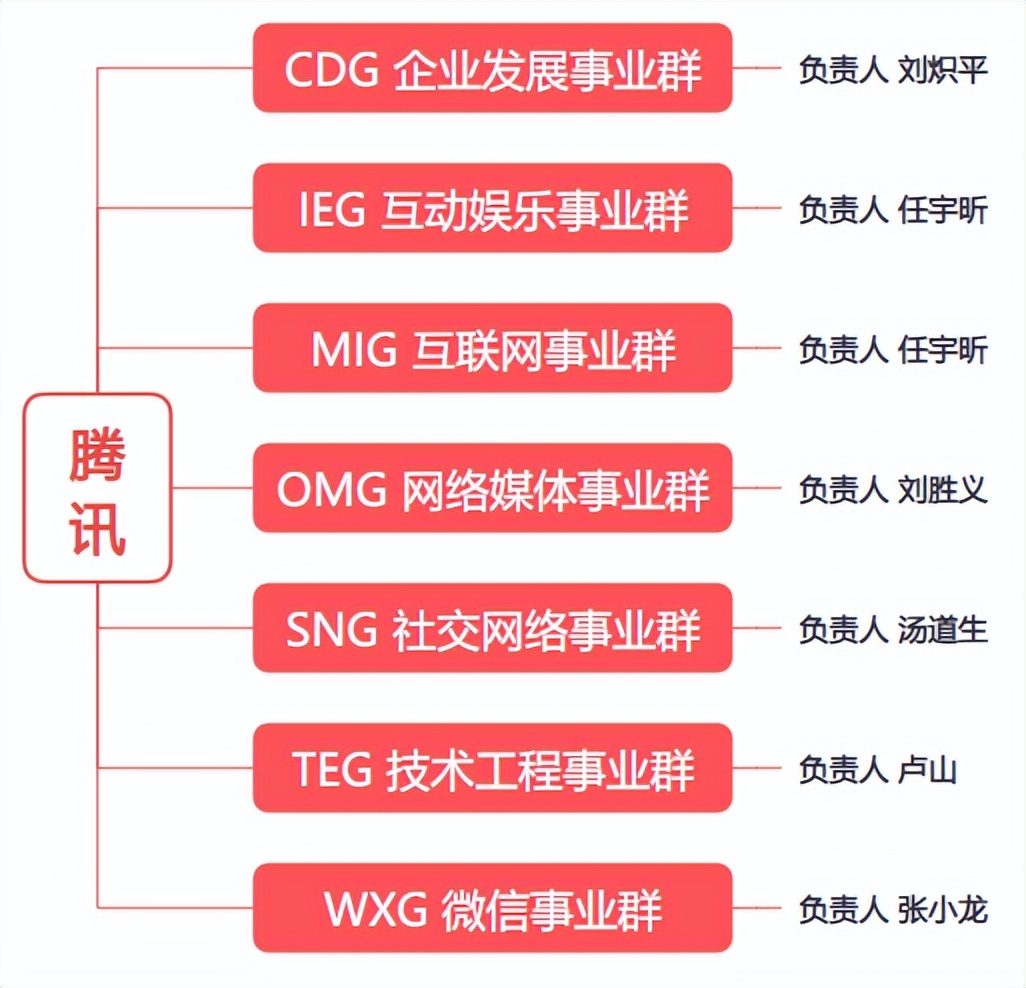 MIG(互联网事业群)、OMG(网络媒体事业群)、SNG(社交网络事业群)全部打散,to C部分被收编进新设的PCG(平台与内容事业群)、to B部分收入CSIG(云与智慧产业事业群)中。