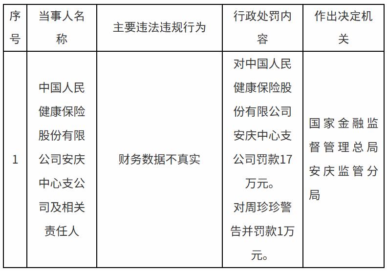 3月6日,国家金融监督管理总局安庆监管分局发布的行政处罚信息公开表显示,中国人民健康保险股份有限公司(以下简称“人保健康”)安庆中心支公司因财务数据不真实被罚款17万元,相关责任人周珍珍被警告并被罚款1万元。