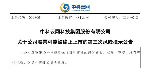 2025年度业绩预告显示,*ST云网预计2025年利润总额、净利润、扣除非经常性损益后的净利润均为负值,预计扣除后营业收入为31000万元至33000万元,预计2025年末净资产为6000万元至8000万元。该数据为财务部门初步测算的结果,未经会计师事务所审计,最终经审计的扣除后营业收入是否高于3亿元,2025年末净资产是否转正,存在不确定性。