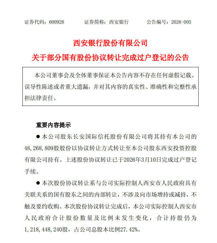 3月12日,西安银行股份有限公司(600928.SH,下称“西安银行”)发布公告称,该行股东长安国际信托股份有限公司将其持有西安银行的约4826.88万股股份以协议转让方式转让至西安银行股东西安投资控股有限公司持有。上述股份协议转让已于2026年3月10日完成过户登记手续。