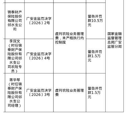 3月13日,国家金融监督管理总局广安监管分局发布的行政处罚信息显示,锦泰财产保险股份有限公司(下称“锦泰财险”)邻水支公司因虚列农险业务管理费,未严格执行内控制度,被警告并罚款10.5万元,时任该公司农险专员李双文被警告并罚款1.5万元。另一张罚单显示,时任该支公司经理蒋华琴因虚列农险业务管理费被警告并罚款1.5万元。