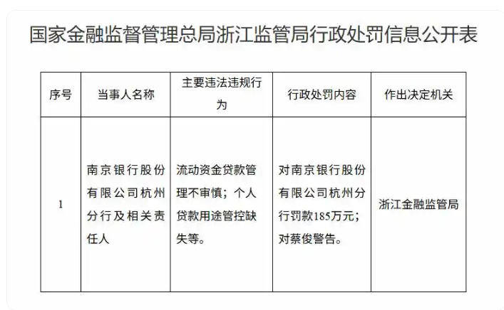 3月19日,国家金融监督管理总局浙江监管局发布的行政处罚信息公开表显示,南京银行杭州分行及相关责任人因“流动资金贷款管理不审慎;个人贷款用途管控缺失等”违法违规行为,被处罚款185万元;相关责任人蔡俊被警告。