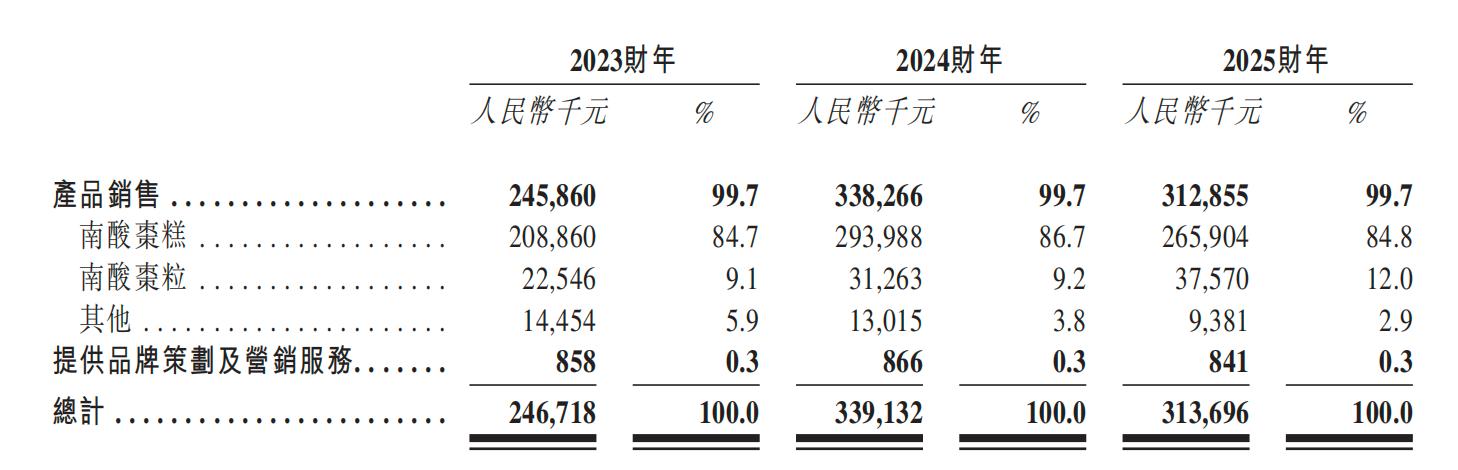 2023-2025年,齐云山食品的南酸枣糕类产品贡献收入分别为2.09亿元、2.94亿元、2.66亿元,收入占比分别为84.7%、86.7%、84.8%。