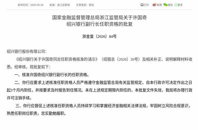3月26日,国家金融监督管理总局浙江监管局发布《关于许国奇绍兴银行股份有限公司(下称“绍兴银行”)副行长任职资格的批复》,核准许国奇绍兴银行副行长的任职资格。