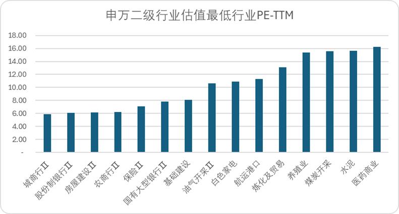 同时我们也统计了申万二级行业的估值情况,从估值的绝对值角度来看,目前除银行、保险外,估值最低的有房屋建设、基础建设、油气开采、白电和航运港口。