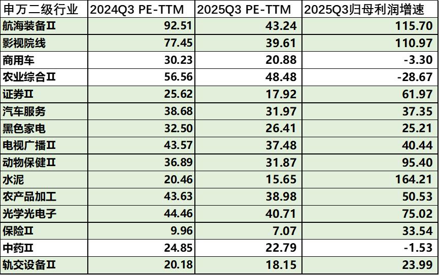 结合三季度的归母利润增速和估值变动来看,由业绩基本面改善导致估值下修的二级行业排名分别为:航海装备、影视院线、证券、汽车服务和黑色家电。