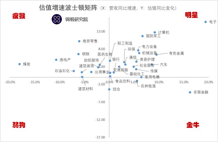 第一象限代表当期营收正增速,同时估值也在增长的“明星”行业,有流动性有业绩,需要关注的是流动性和业绩的关系,以及增长是否可以持续。