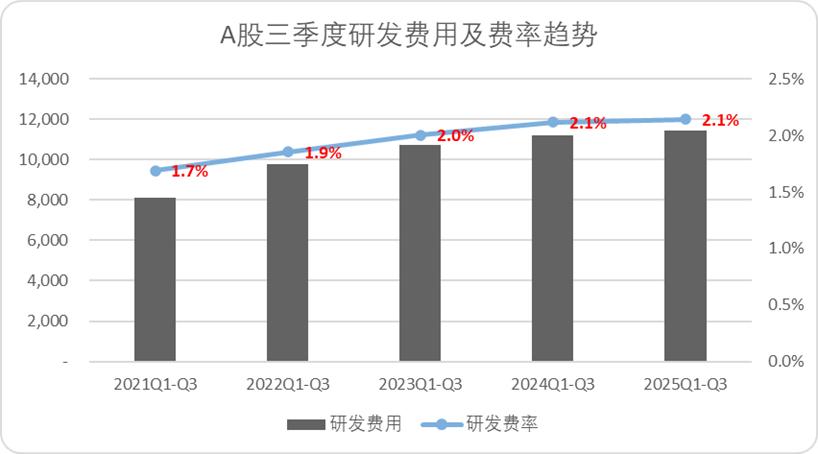 今年前三季度A股整体的研发费用累计录得1.15万亿,略高于去年同期,不过从费率结构来看,今年和去年的研发费率差距不大,仅仅提升了0.02pct。