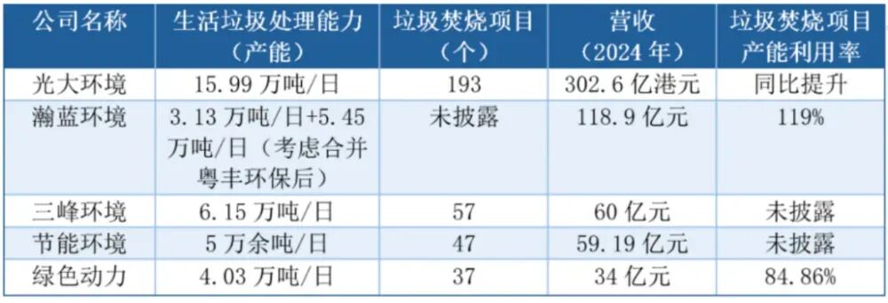 部分垃圾焚烧类上市企业的业务数据 图源:每日经济新闻