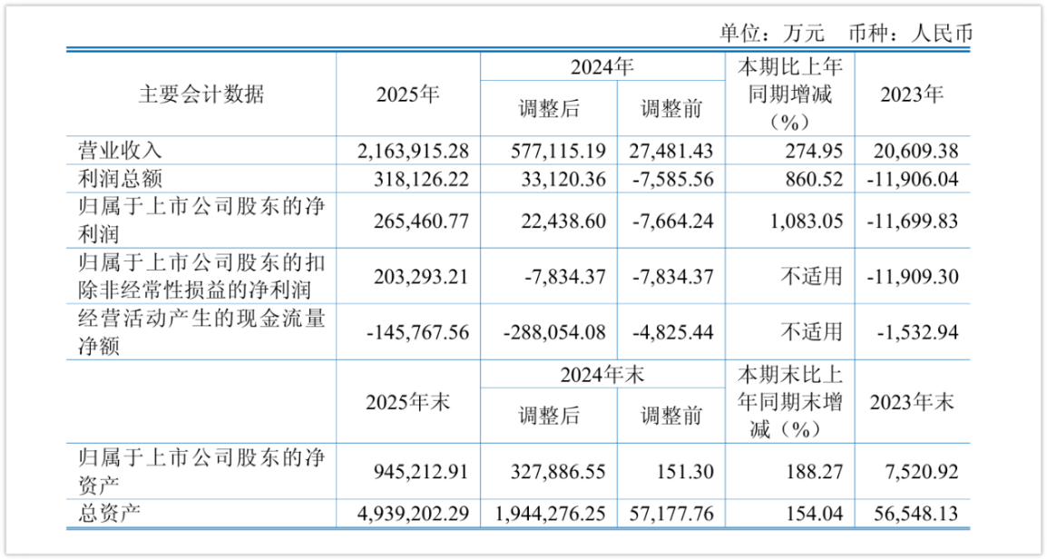 前一年,公司还是一家主营日用陶瓷的传统制造企业,全年营业收入仅2.75亿元,归母净利润亏损7664万元,扣非后亏损7834.37万元,并因连续亏损被实施退市风险警示。然而在3月9日刚刚发布的2025年年报中,公司营业收入跃升至216.39亿元,归母净利润达到26.55亿元,期末净资产增至94.52亿元。