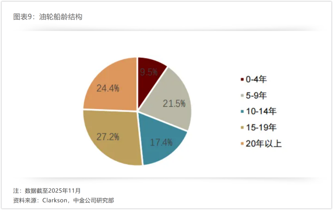 需求端最大的问题来自全球船队老龄化。到2025年底,全球船队平均船龄已达到22.6年,15年以上船龄船舶占比升至45.2%。其中油轮的老化更为明显,20年以上和15至19年船龄的船舶合计占比已超过一半。