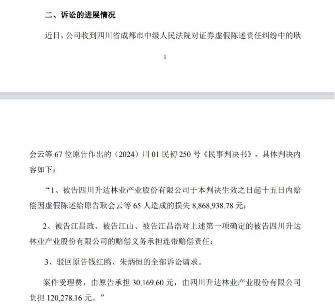 根据公告,公司收到四川省成都市中级人民法院对证券虚假陈述责任纠纷中的耿会云等 67 位原告作出的(2024)川 01 民初 250 号《民事判决书》,升达林业被判赔偿给原告耿会云等 65 人造成的损失 886.89万元。被告江昌政、被告江山、被告江昌浩对上述赔偿义务承担连带赔偿责任。