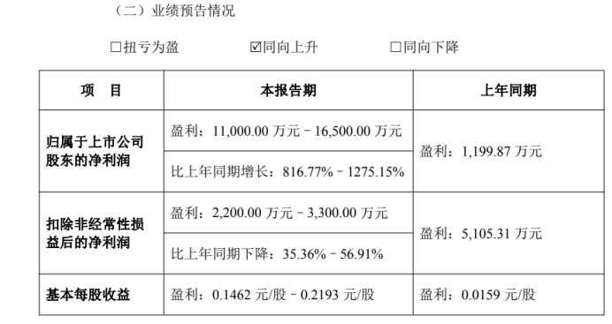 根据此前披露的业绩预告,升达林业预计2025年实现归属于上市公司股东的净利润1.1亿元至1.65亿元,同比增长816.77%至1275.15%;预计2025年扣除非经常性损益后的净利润为2200万元至3300万元,同比下降35.36%至56.91%。