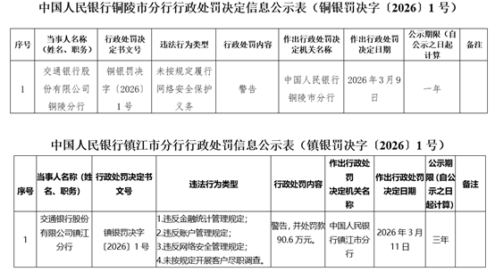 交通银行股份有限公司镇江分行则由于违反金融统计管理规定;违反账户管理规定;违反网络安全管理规定;未按规定开展客户尽职调查,被中国人民银行镇江市分行警告,并处罚款90.6万元。