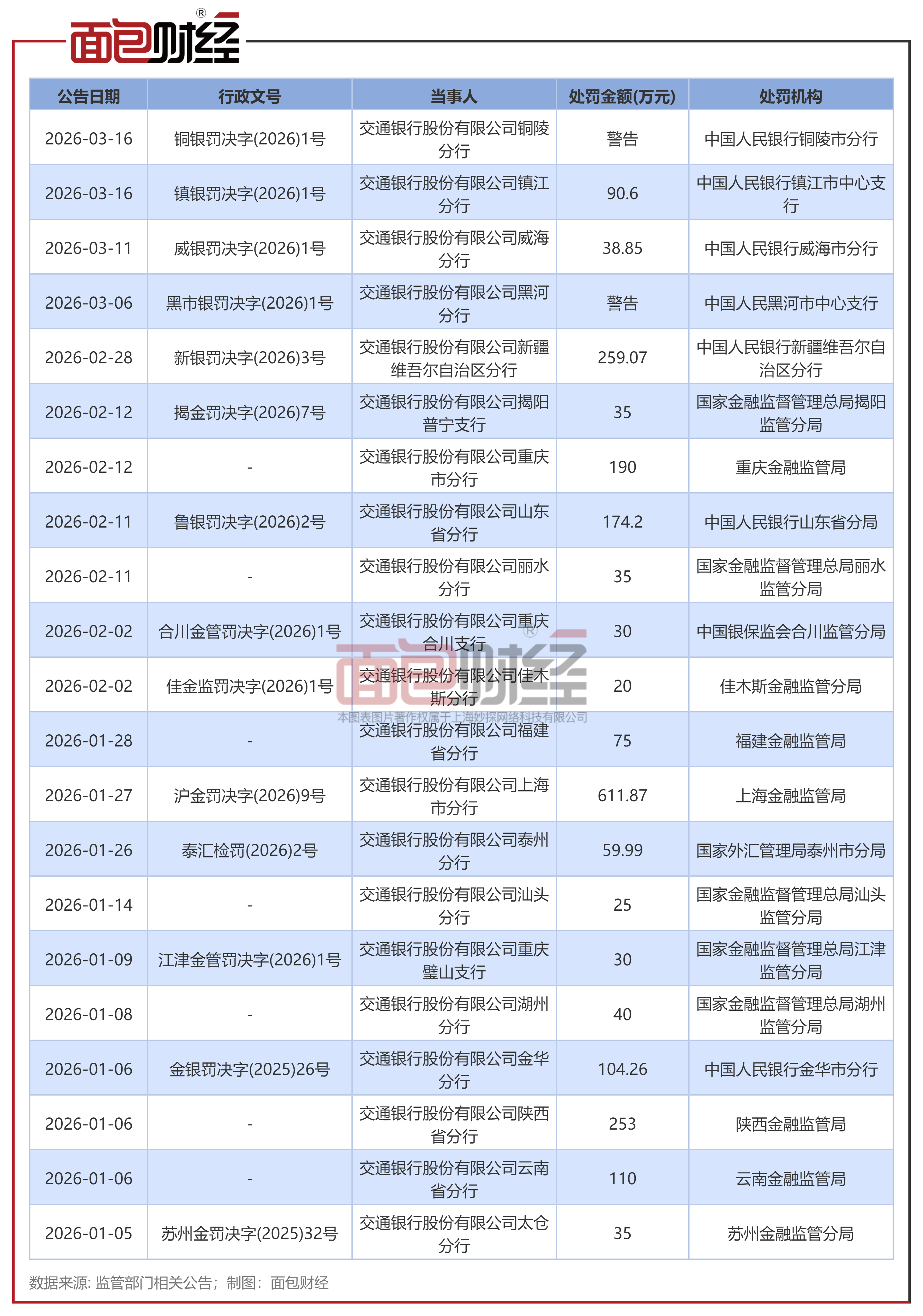 面包财经根据监管部门披露的处罚公告统计,2026年以来,交通银行累计被罚没超2200万元(不含个人处罚),其中百万以上罚单共计7张。