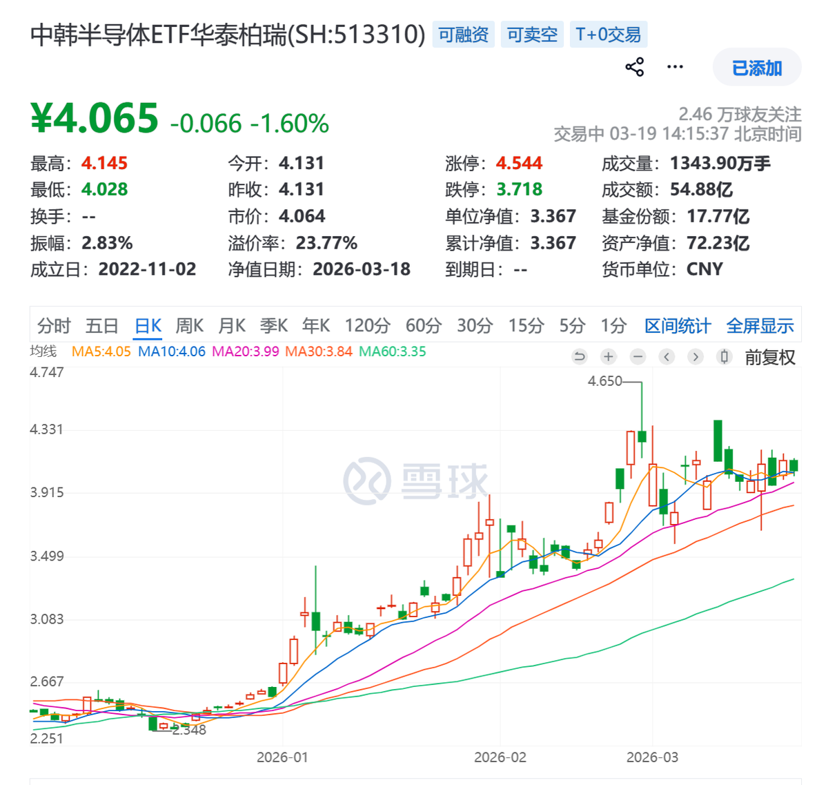 3月19日,中韩半导体ETF收跌超1%,而它的实时溢价率是:23.83%。今年以来,这个ETF保持高溢价状态收获了接近60%的涨幅。