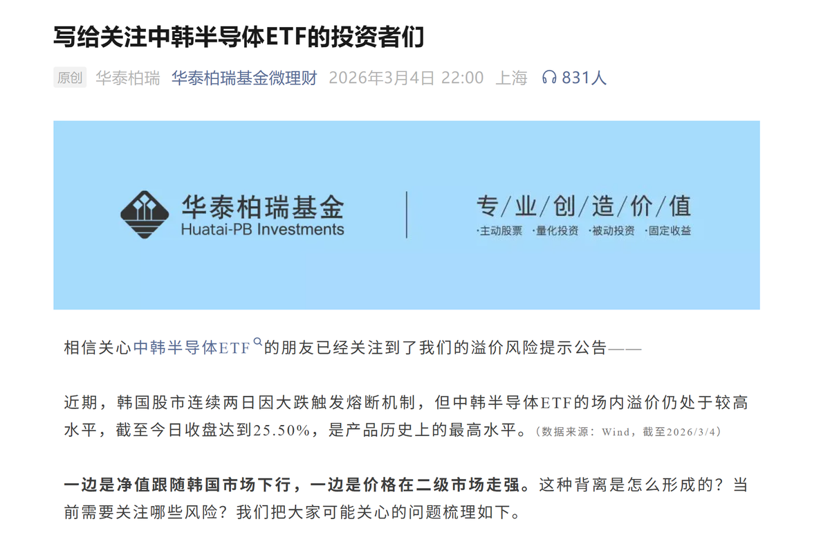 而中韩半导体ETF背后的华泰柏瑞基金公司,显然深知市场情绪的问题。它曾连续发布溢价风险提示、临时停牌,把产品风险等级从R3提升到R4,并暂停联接基金申购,在公众号等渠道持续警示风险。