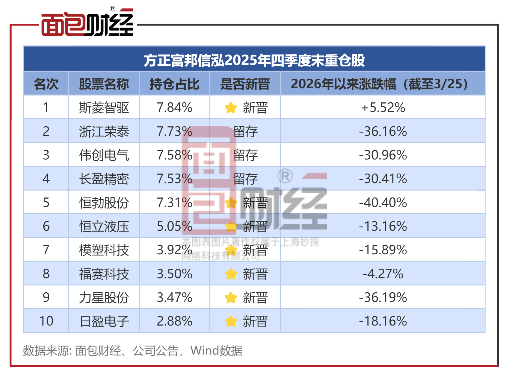 从2025年四季度来看,方正富邦信泓的前十大重仓股持仓高度集中,且全部聚焦于科技成长领域。四季度末,基金前十大重仓股合计持仓占比超过50%,属于典型的“重仓押注”模式。