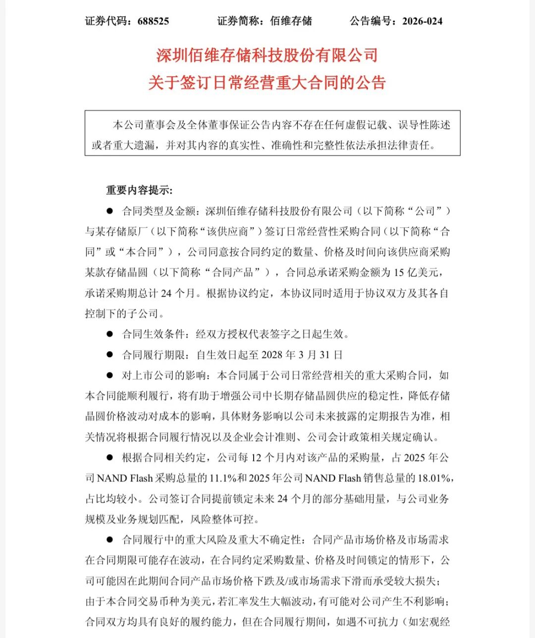 3月24日晚间,佰维存储发布公告称,公司与某存储原厂签订一项日常经营性采购合同,将按约定的数量、价格及时间向该供应商采购某款存储晶圆。合同总承诺采购金额为15亿美元(约合人民币103亿元),采购期共计24个月,自2026年第二季度起至2028年第一季度止。