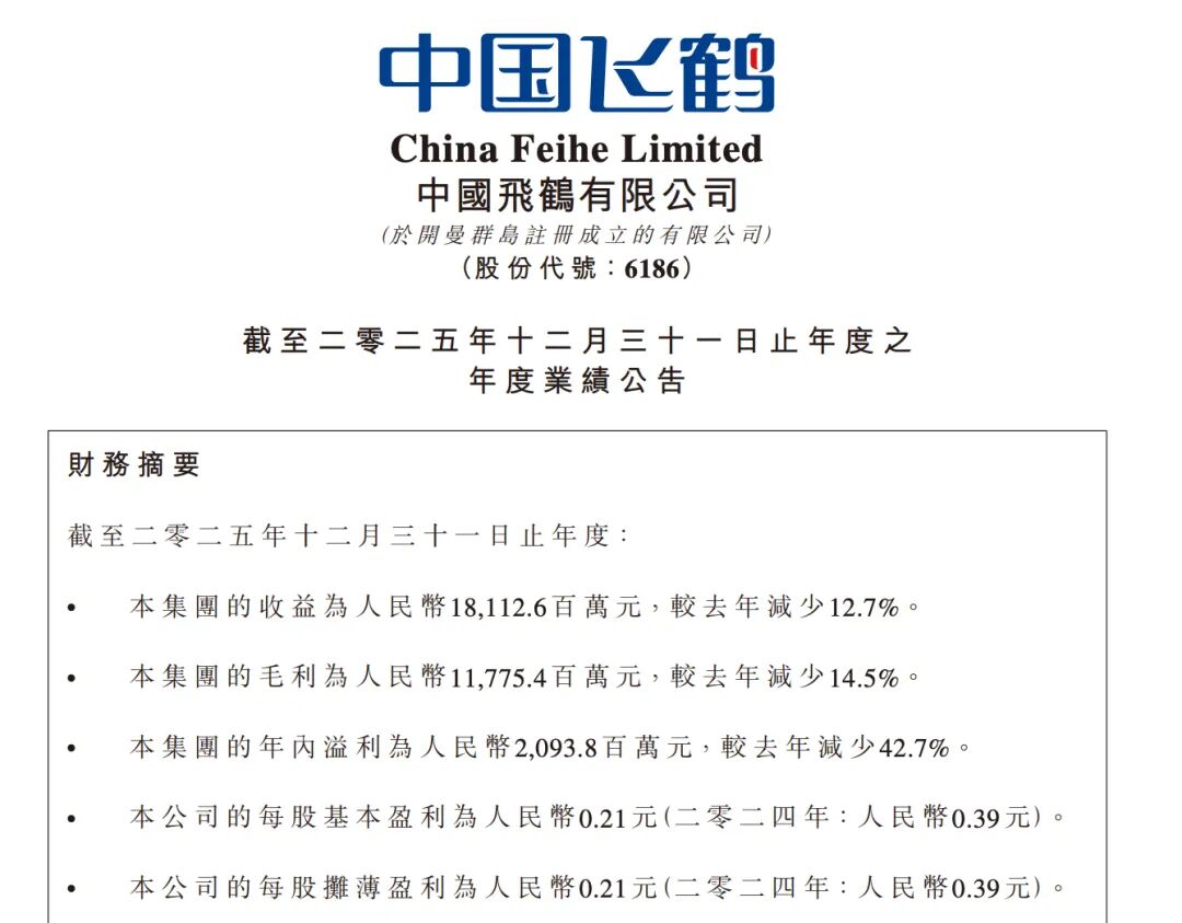 3月26日晚间,中国飞鹤(06186.HK)发布2025年财报。