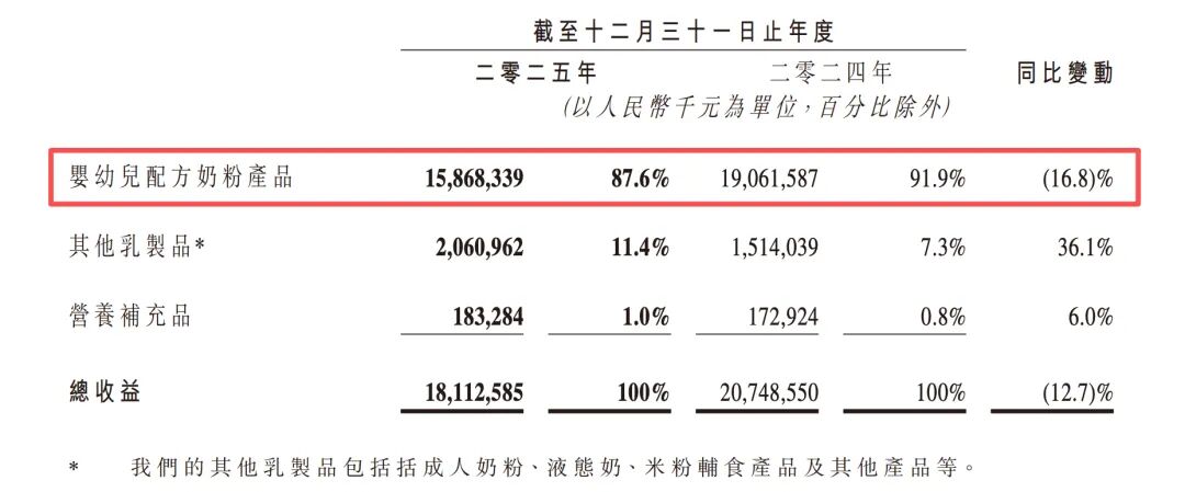 原本的“利润支柱”——婴幼儿配方奶粉的业绩出现大幅下滑,去年营收为158.68亿元,同比下滑16.8%,拉低了整体增速,在公司内部占比首次下滑至87.6%。
